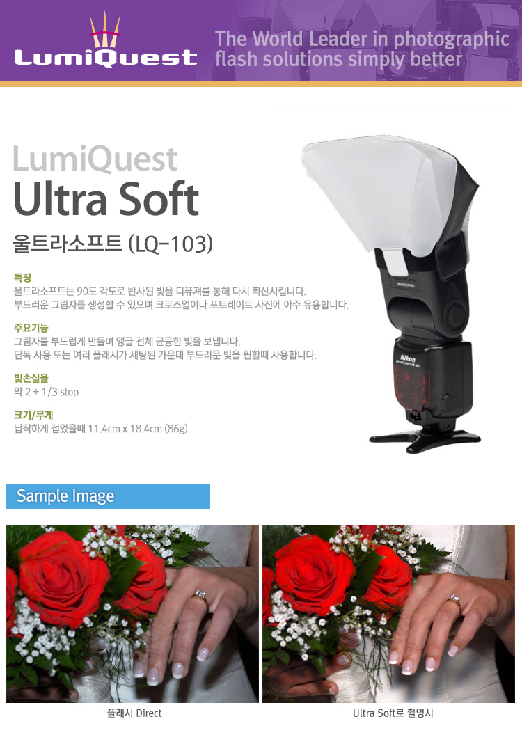 – 90도 각도로 반사된 빛을 디퓨저를 통해 확신시킵니다.- 부드러운 그림자를 생성할 수 있으며 클로즈업이나 포트레이트 사진에 유용합니다.- 그림자를 부드럽게 만들어 앵글 전체에 균등한 빛을 보냅니다.