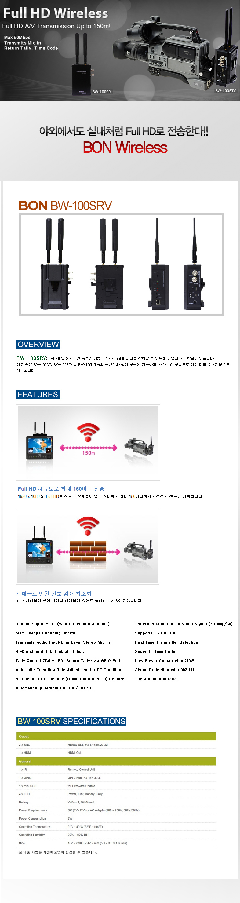 본 모니터 BW-100SRV 수신기 /HDMI Out/HD/SD-SDI/3G/V-mount 배터리