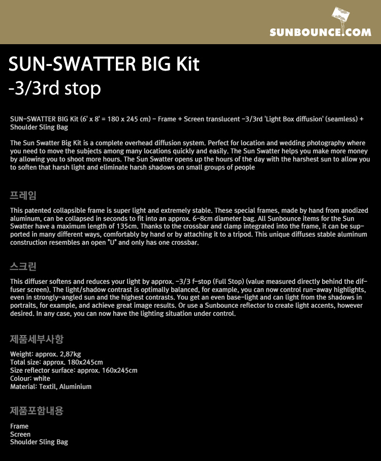썬바운스 SUN-SWATTER BIG Kit -3/3rd stop /반투명 3/3 디퓨저 스크린/180 x 245cm/가방 포함