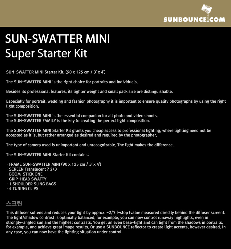 썬바운스 SUN-SWATTER MINI -2/3rd Super Starter Kit /반투명 2/3 디퓨저 스크린/90 x 125cm/3단 알루미늄 붐스틱/튜닝클립x4/그립헤드/가방 포함