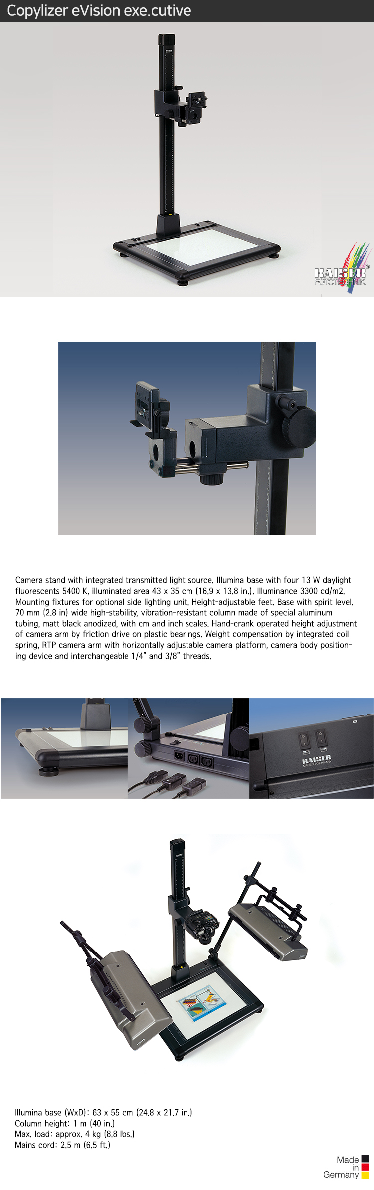 카이저 Copylizer, 5212 /카메라 Arm, 봉, 조명 베이스 플레이트/높이 100cm, 베이스 크기 63cm x 55cm, 조명 면적 43cm x 35cm