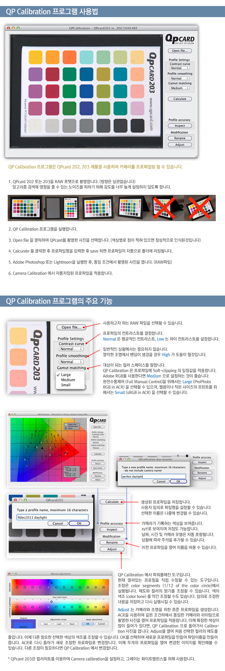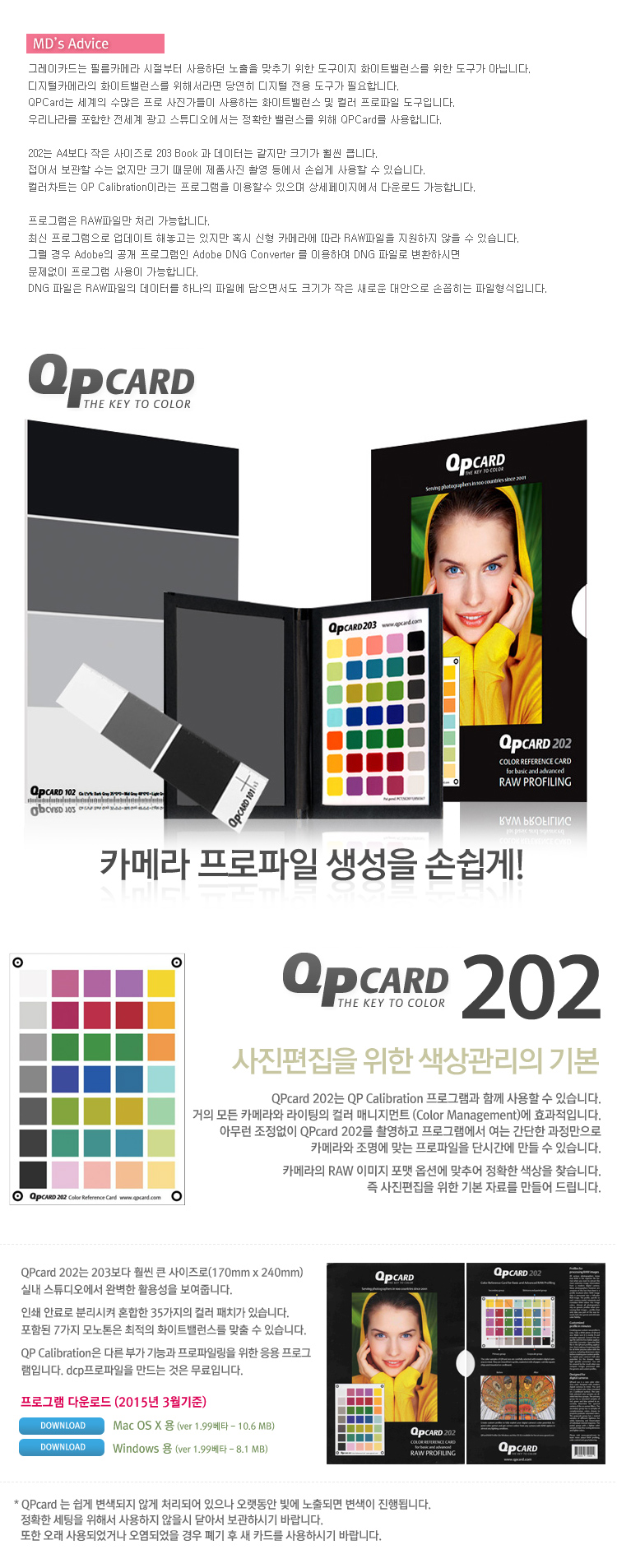 – 35가지 다른 컬러들에 대한 레퍼런스 카드로 색상관리의 기본- RAW파일 전용카드로 QP Calibration 프로그램으로 사용가능- 인쇄 안료로부터 분리시켜 혼합하여 색이 잘 바래지 않도록 처리- 170mm x 240mm의 카드 1장 포함