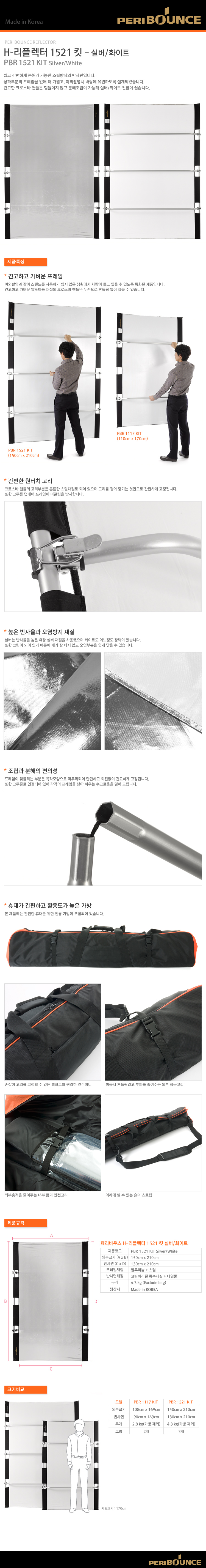 – 쉽고 간편한 분해조립 방식의 H형 반사판입니다.- 상하 프레임이 없어 가볍고, 야외촬영시 바람에 유연하도록 설계되었습니다.- 견고하고 설치가 간편한 크로스바 핸들로 실버/화이트 전환이 쉽습니다.