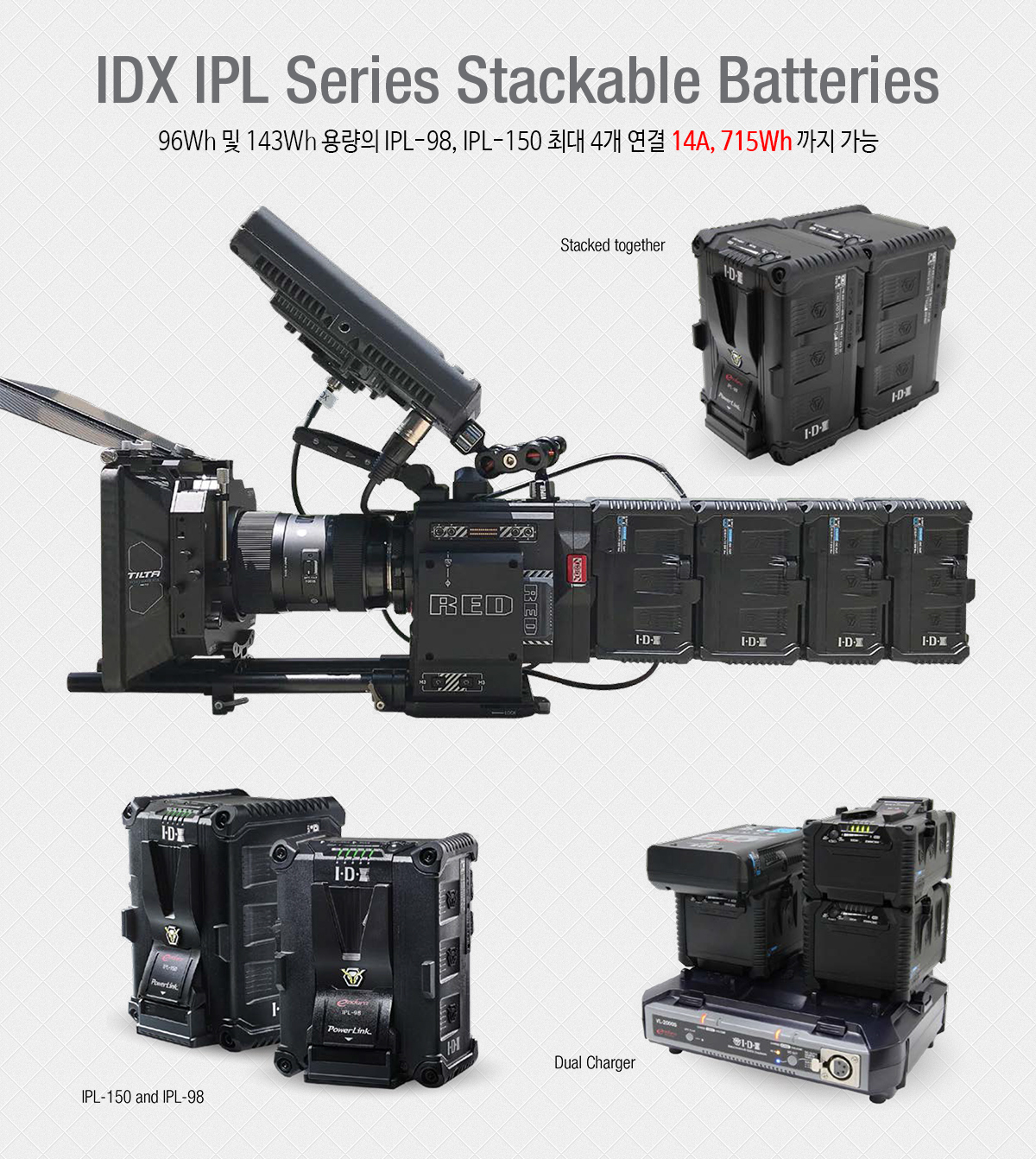 전력량을 포함합니다. 인상적인 성능은 고출력 조명, 전력 소모가 많은 카메라와 함께 사용하기에 완벽하며 모든 유형의 프로덕션에 적합합니다. 모든 이전 CUE 시리즈 배터리와 마찬가지로